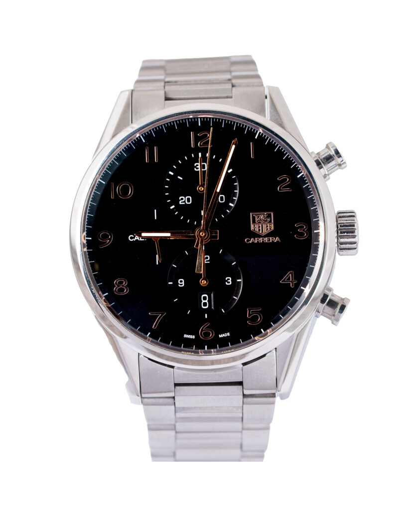 brand: Tag Heuer Reference: CAR2014-0 Model: Carrera Calibre 1887 case MATERIAL: Steel strap: Bracelet case Size (MM): 43mm Dial colour: Black Bezel: Steel Year: 11/2014 Condition: Excellent Box papers : Paperwork/box