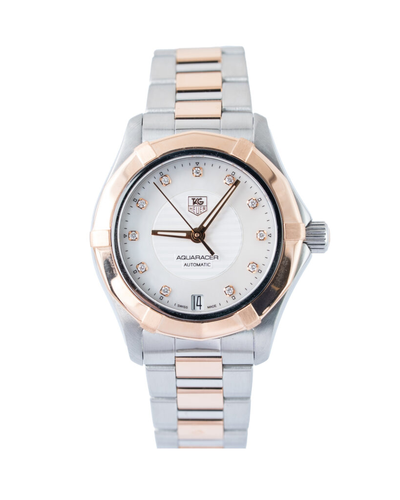 brand: Tag Heuer Reference: WAP2351.BD0838 Model: Aquaracer Lady Automatic case MATERIAL: Steel & Rose Gold strap: Bracelet case Size (MM): 34mm Dial colour: Mother Of Pearl Bezel: Rose Gold Year: 06/2015 Condition: Excellent Box papers : Paperwork/box