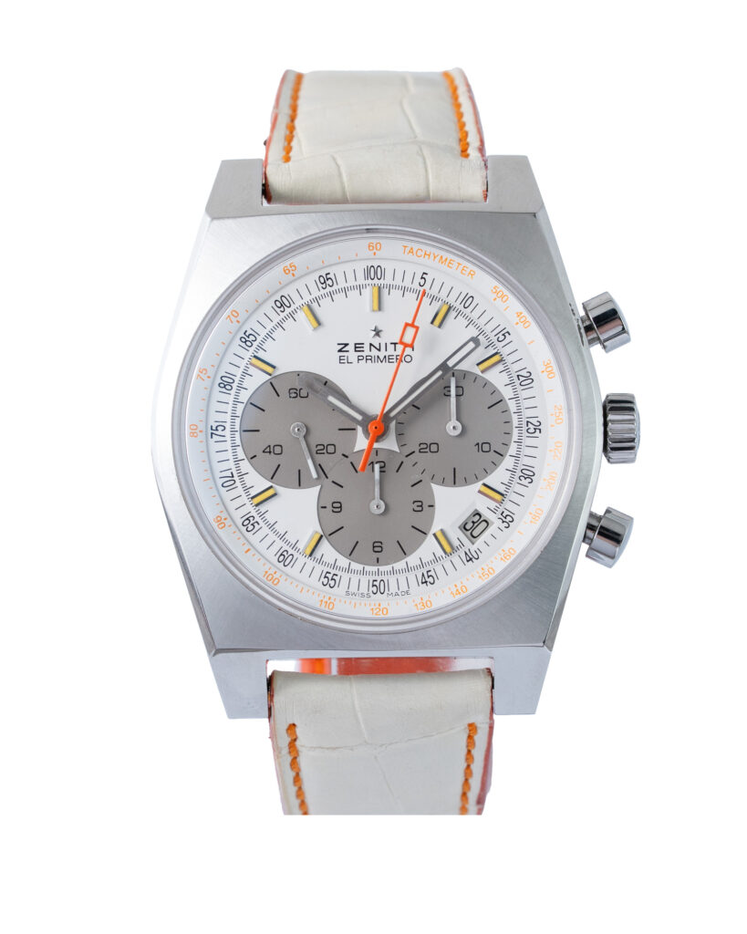brand: Zenith Reference: 03.1969.401 Model: El Primero case MATERIAL: Steel strap: Leather case Size (MM): 39mm Dial colour: White Bezel: Steel Year: 09/2014 Condition: Excellent Box papers : Paperwork/box