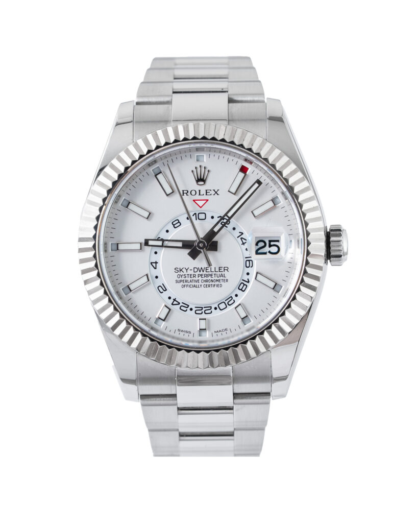 brand: Rolex Reference: 326934 Model: Sky-Dweller case MATERIAL: Steel strap: Bracelet case Size (MM): 42mm Dial colour: White Bezel: White Gold Condition: Excellent Box papers : Paperwork/box