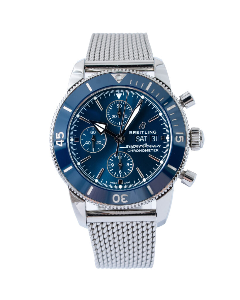 brand: Breitling Reference: A13313 Model: Superocean Heritage case MATERIAL: Steel strap: Bracelet case Size (MM): 44mm Dial colour: Blue Bezel: Ceramic Condition: Excellent Box papers : Paperwork/box