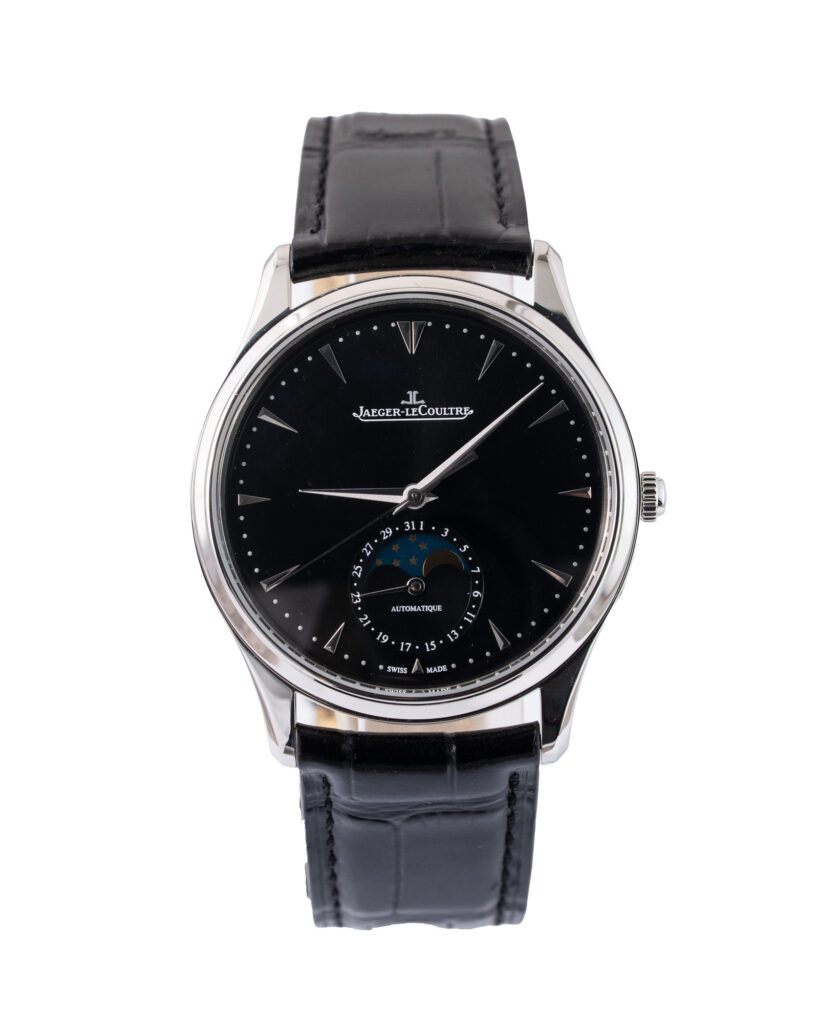 brand: Jaeger-Lecoultre Reference: Q1368470 Model: Master Ultra Thin Moon case MATERIAL: Steel strap: Leather case Size (MM): 39mm Dial colour: Black Bezel: Steel Year: 09/2019 Condition: Excellent Box papers : Paperwork/box