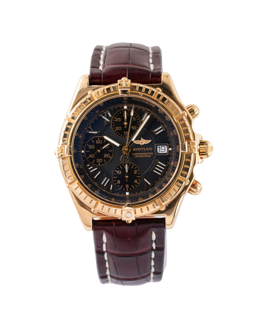 brand: Breitling Reference: K13355 Model: Crosswind Chronograph case MATERIAL: Yellow Gold strap: Leather case Size (MM): 43mm Dial colour: Black Bezel: Yellow Gold Year: 01/2005 Condition: Excellent Box papers : Paperwork/box