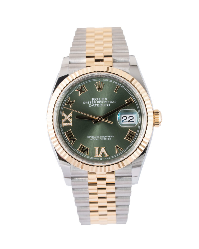 brand: Rolex Reference: 126233 Model: Datejust case MATERIAL: Steel & Yellow Gold strap: Bracelet case Size (MM): 36mm Dial colour: Green Bezel: Yellow Gold Year: 02/2026 Condition: Unworn Box papers : Paperwork/box