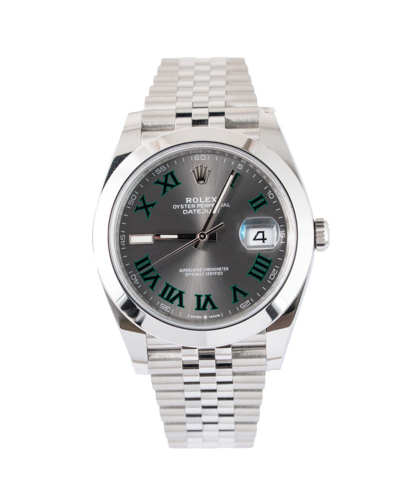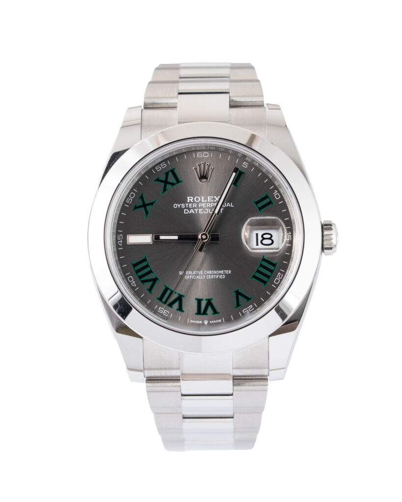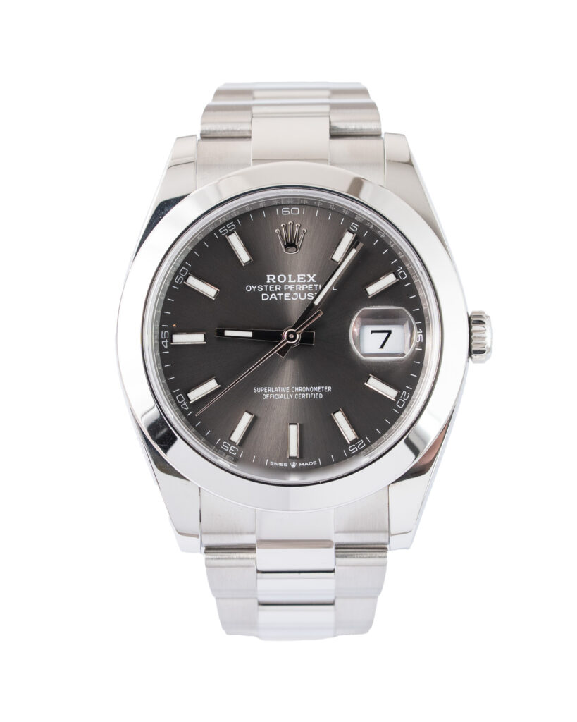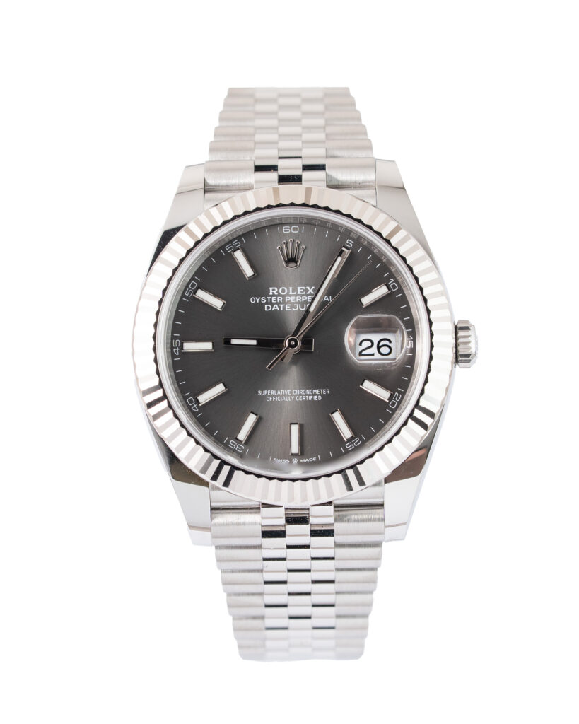 brand: Rolex Reference: 126300 Model: Datejust case MATERIAL: Steel strap: Bracelet case Size (MM): 41mm Dial colour: Grey Bezel: Steel Condition: Unworn Box papers : Paperwork/box