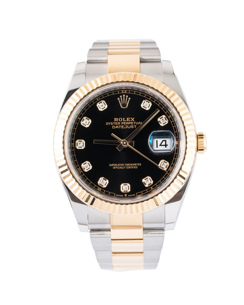 brand: Rolex Reference: 126333 Model: Datejust case MATERIAL: Steel & Yellow Gold strap: Bracelet case Size (MM): 41mm Dial colour: Black Bezel: Yellow Gold Condition: Excellent Box papers : Paperwork/box