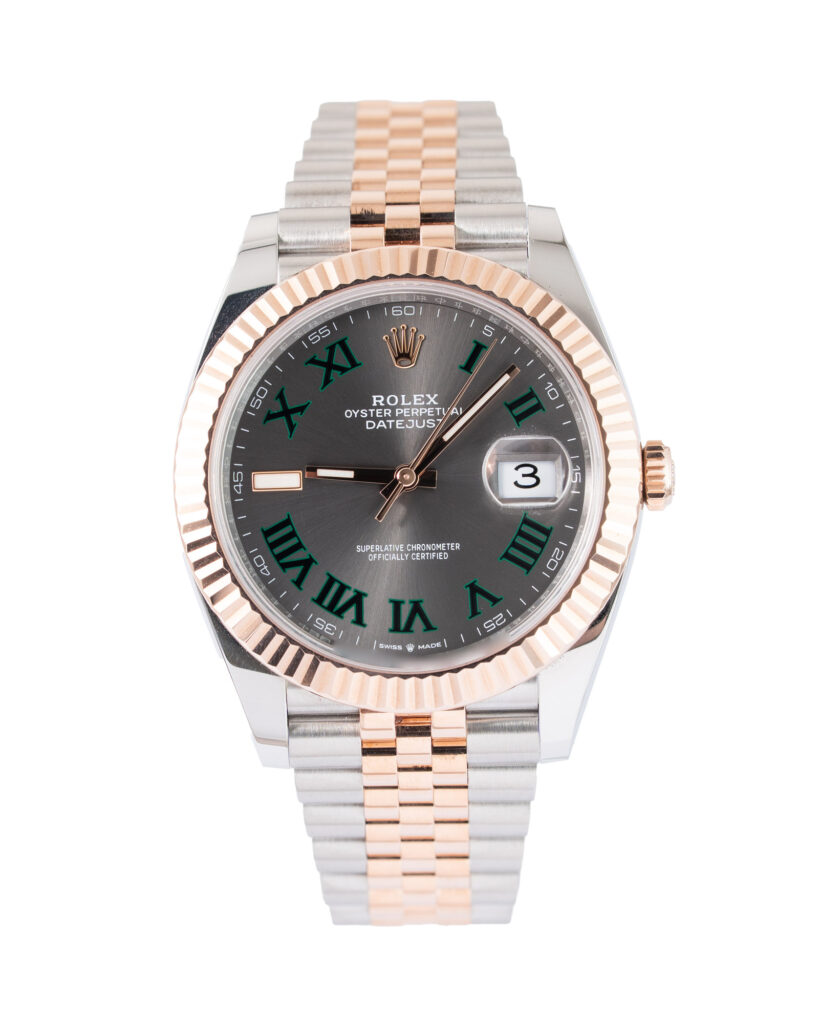 brand: Rolex Reference: 126331 Model: Datejust case MATERIAL: Steel & Rose Gold strap: Bracelet case Size (MM): 41mm Dial colour: Grey Bezel: Rose Gold Condition: Excellent Box papers : Paperwork/box