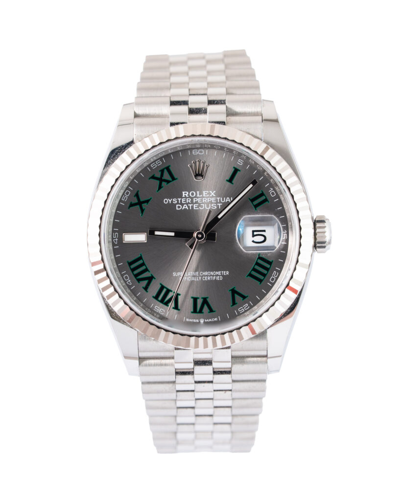 brand: Rolex Reference: 126334 Model: Datejust case MATERIAL: White Gold strap: Bracelet case Size (MM): 41mm Dial colour: Grey Bezel: White Gold Condition: Excellent Box papers : Paperwork/box