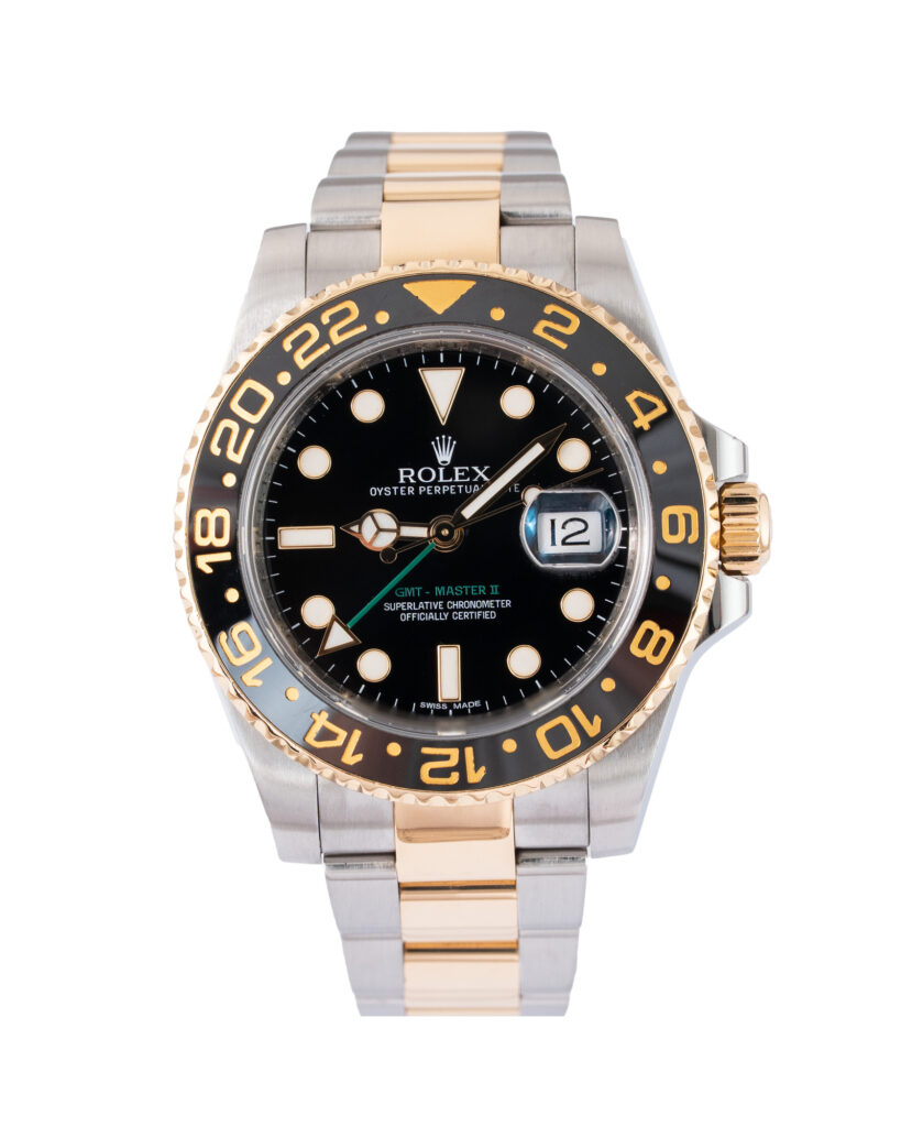 brand: Rolex Reference: 116713LN Model: GMT-Master II case MATERIAL: Steel & Yellow Gold strap: Bracelet case Size (MM): 40mm Dial colour: Black Bezel: Ceramic Year: 06/2012 Condition: Excellent Box papers : Paperwork/box