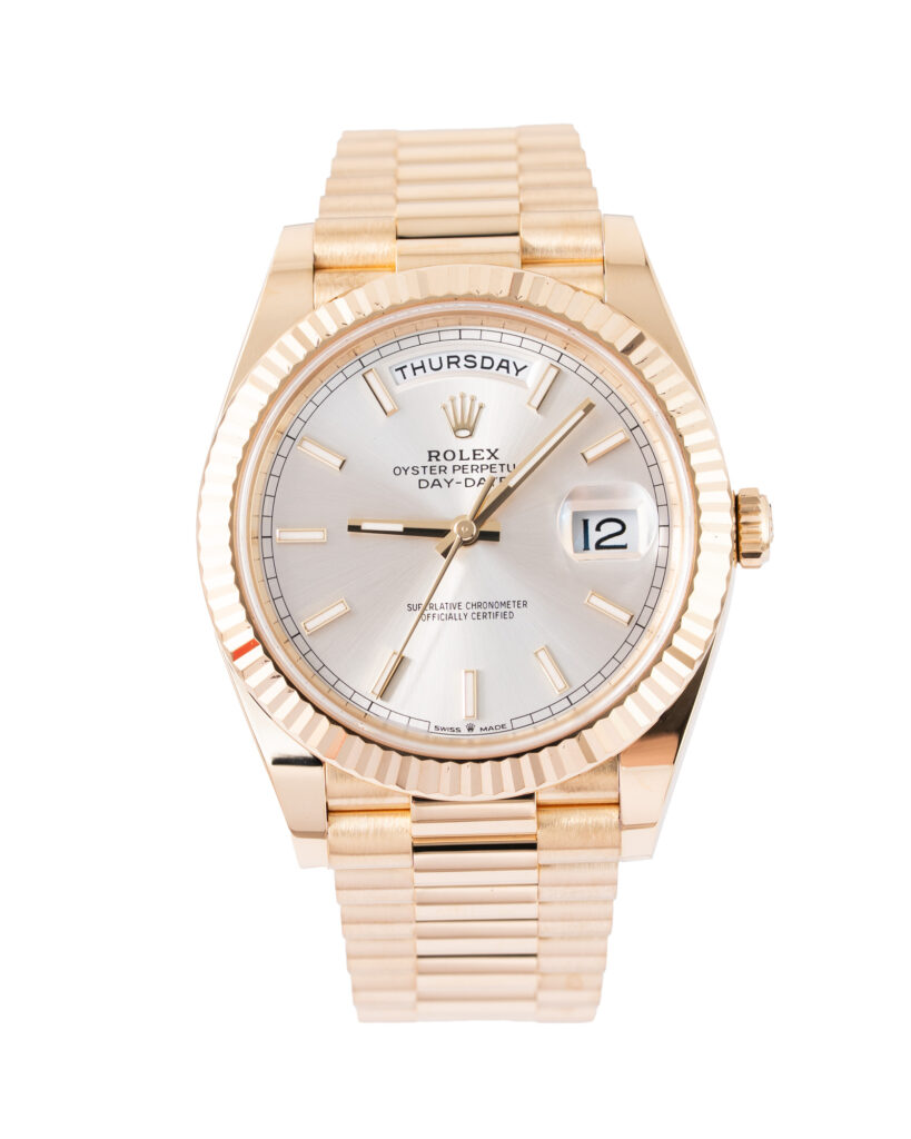 brand: Rolex Reference: 228238 Model: Day-Date case MATERIAL: Yellow Gold strap: Bracelet case Size (MM): 40mm Dial colour: Silver Bezel: Yellow Gold Year: 12/2023 Condition: Excellent Box papers : Paperwork/box