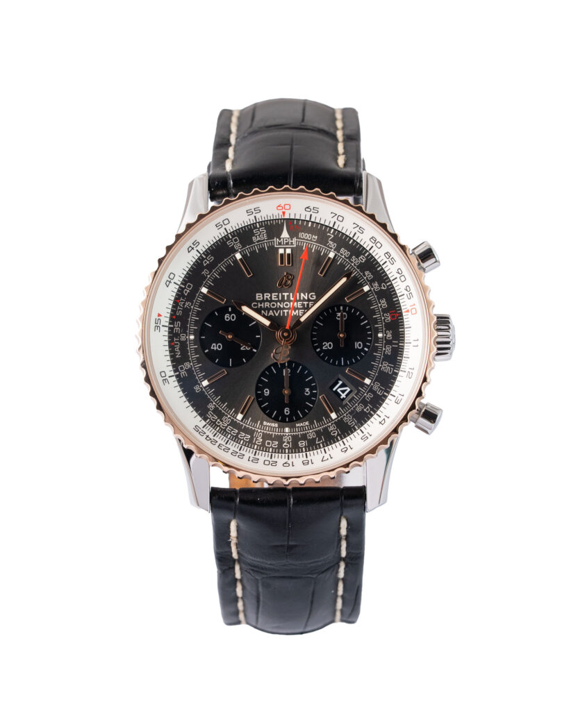 brand: Breitling Reference: UB0121211F1P1 Model: Navitimer 1 B01 case MATERIAL: Steel & Rose Gold strap: Leather case Size (MM): 43mm Dial colour: Grey Bezel: Rose Gold Year: 09/2019 Condition: Excellent Box papers : Complete