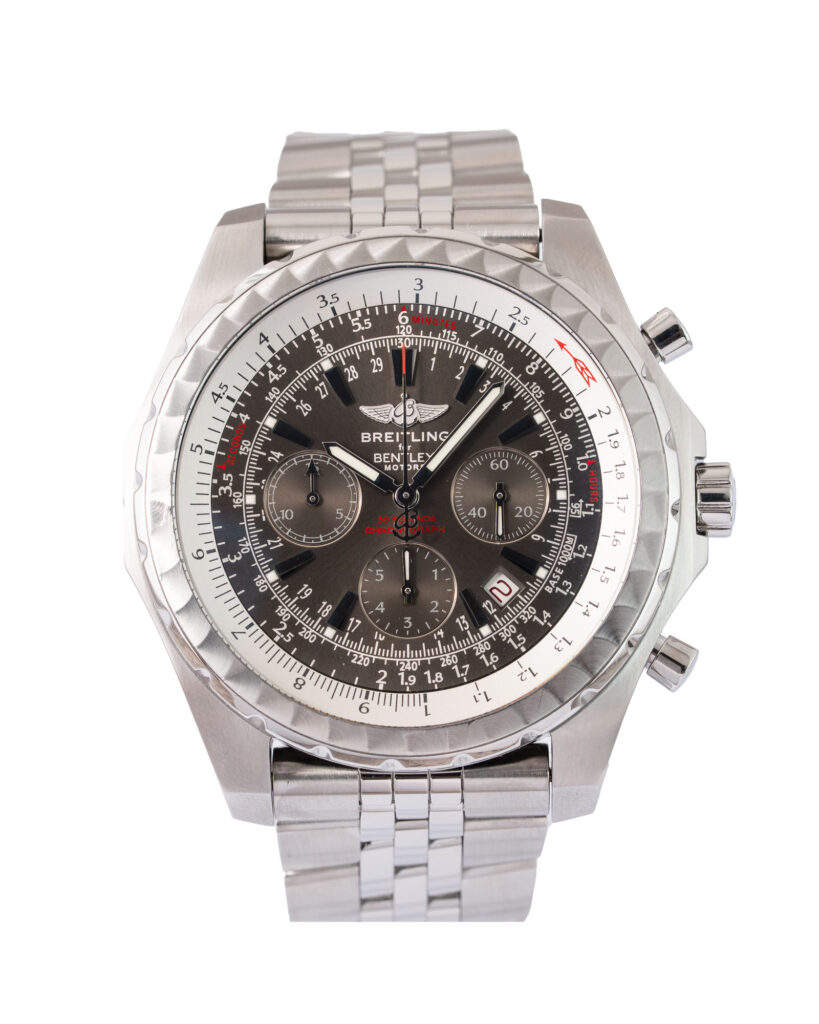 brand: Breitling Reference: A25363 Model: Bentley Motors case MATERIAL: Steel strap: Bracelet case Size (MM): 48mm Dial colour: Grey Bezel: Steel Condition: Excellent Box papers : Watch Only