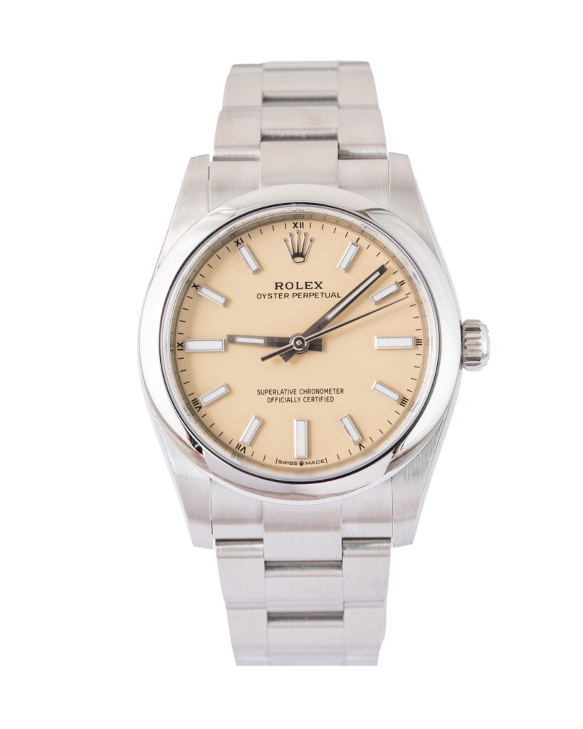brand: Rolex Reference: 124200 Model: Oyster Perpetual case MATERIAL: Steel strap: Bracelet case Size (MM): 34mm Dial colour: Beige Bezel: Steel Year: 08/2025 Condition: Excellent Box papers : Paperwork/box