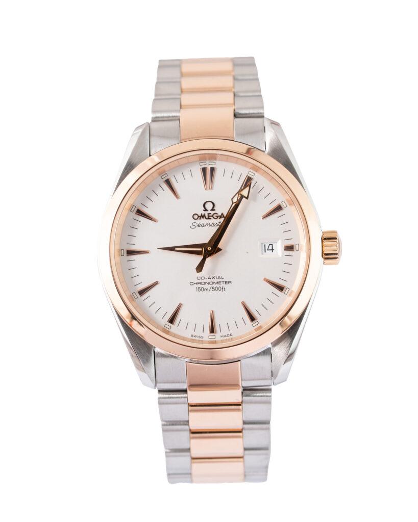 brand: Omega Reference: 2303.30.00 Model: Seamaster Aqua Terra case MATERIAL: Steel & Rose Gold strap: Bracelet case Size (MM): 39mm Dial colour: White Bezel: Rose Gold Year: 01/2005 Condition: Excellent Box papers : Paperwork/box