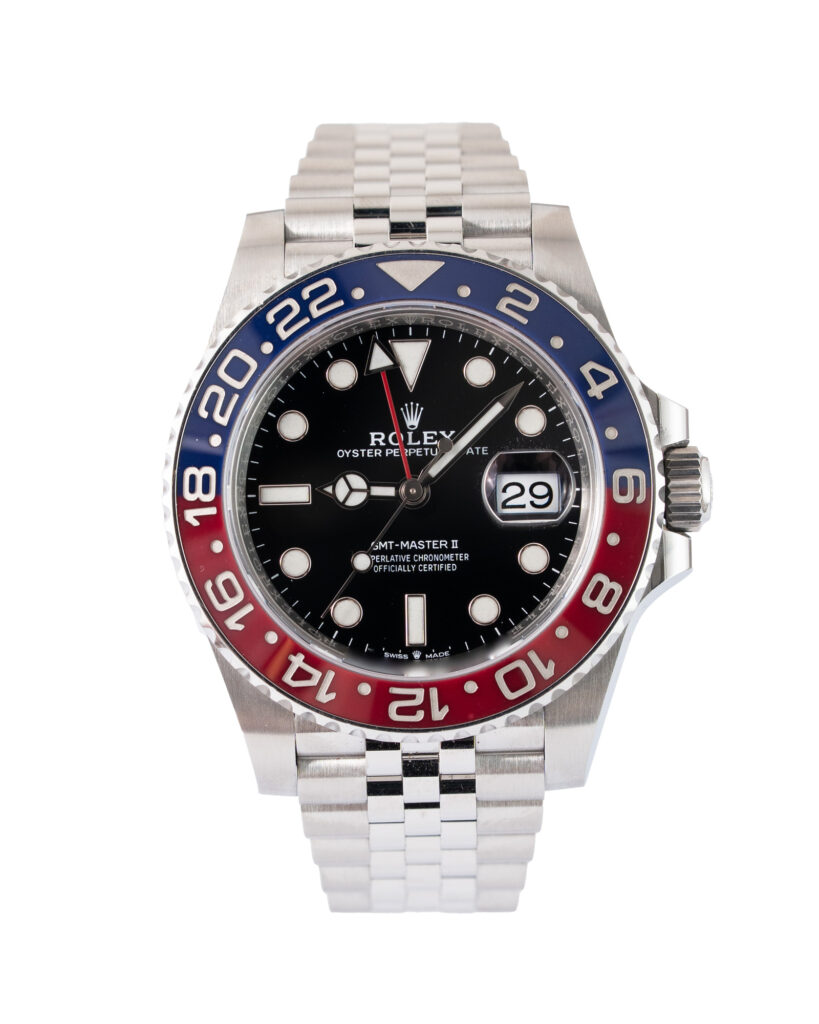 brand: Rolex Reference: 126710BLRO Model: GMT Master case MATERIAL: Steel strap: Bracelet case Size (MM): 40mm Dial colour: Black Bezel: Ceramic Condition: Excellent Box papers : Paperwork/box