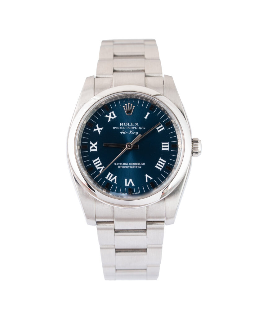 brand: Rolex Reference: 114200 Model: Airking case MATERIAL: Steel strap: Bracelet case Size (MM): 34mm Dial colour: Blue Bezel: Steel Condition: Excellent Box papers : Paperwork/box