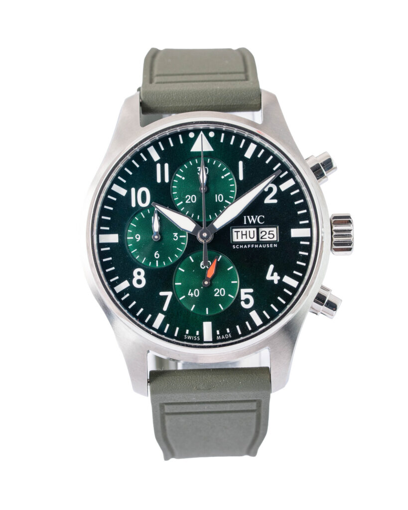 brand: IWC Reference: IW378005 Model: Pilot Chronograph case MATERIAL: Steel case Size (MM): 43mm Dial colour: Green Bezel: Steel Condition: Excellent Box papers : Paperwork/box