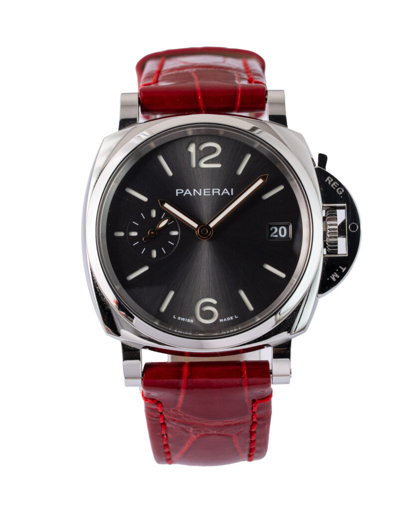 brand: Panerai Reference: PAM01247 Model: Luminor Due case MATERIAL: Steel strap: Leather case Size (MM): 38mm Dial colour: Grey Bezel: Steel Year: 06/2023 Condition: Excellent Box papers : Paperwork/box