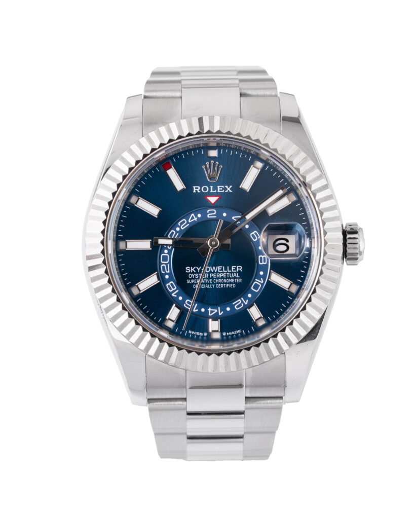 brand: Rolex Reference: 336934 Model: Sky-Dweller case MATERIAL: Steel strap: Bracelet case Size (MM): 42mm Dial colour: Blue Bezel: White Gold Year: 07/2024 Condition: Excellent Box papers : Paperwork/box