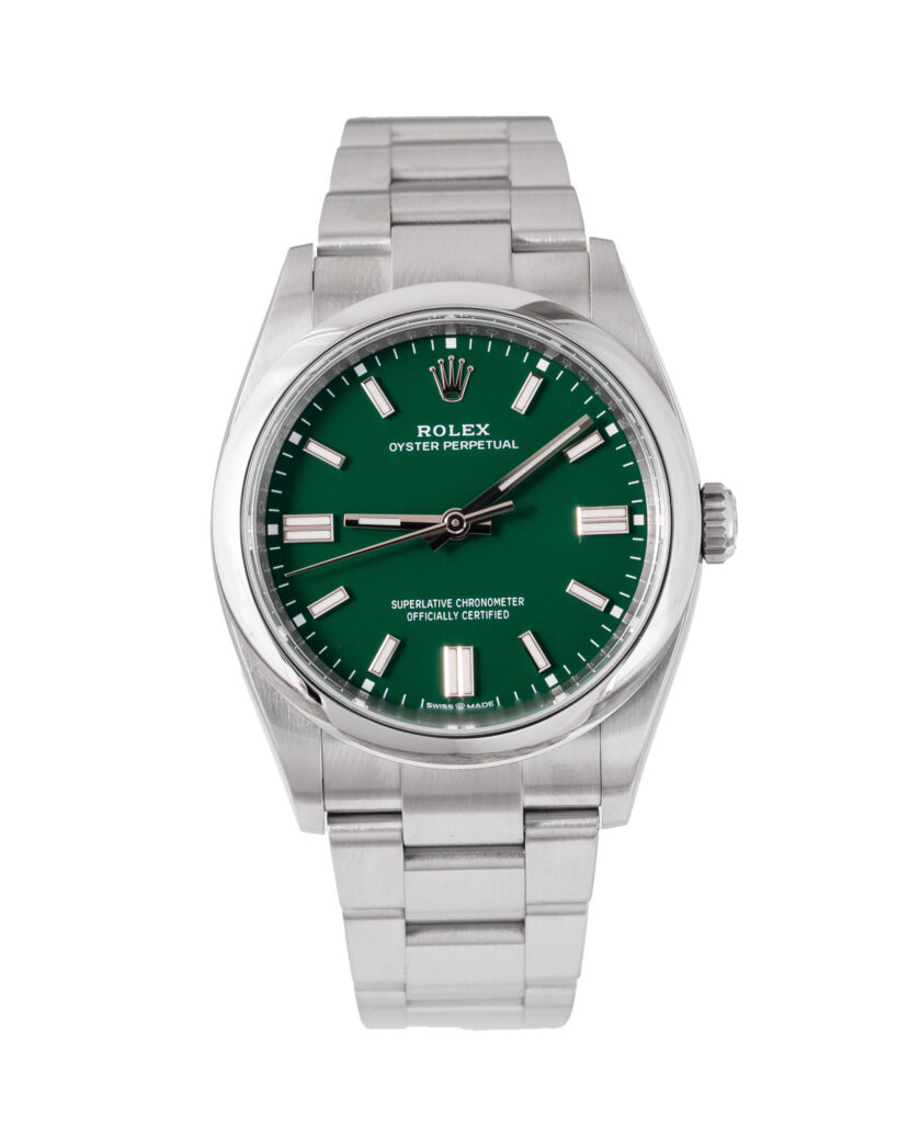 brand: Rolex Reference: 126000 Model: Oyster Perpetual case MATERIAL: Steel strap: Bracelet case Size (MM): 36mm Dial colour: Green Bezel: Steel Year: 06/2022 Condition: Excellent Box papers : Paperwork/box