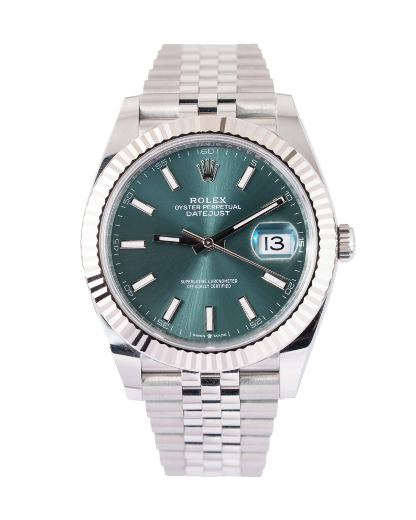 brand: Rolex Reference: 126334 Model: Datejust case MATERIAL: Steel strap: Bracelet case Size (MM): 41mm Dial colour: Green Bezel: White Gold Condition: Excellent Box papers : Paperwork/box
