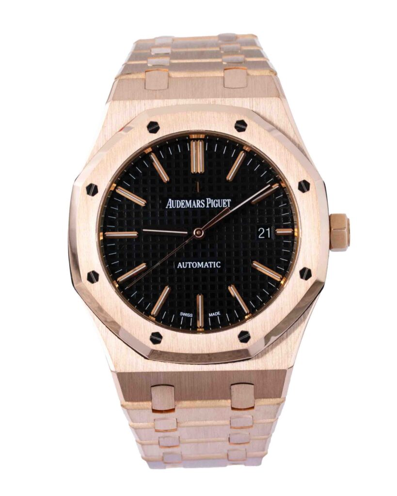 brand: Audemars Piguet Reference: 15400OR.OO.1220OR.01 Model: Royal Oak case MATERIAL: Rose Gold strap: Bracelet case Size (MM): 41mm Dial colour: Black Bezel: Rose Gold Condition: Good Box papers : Paperwork/box