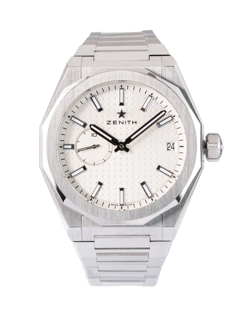 brand: Zenith Reference: 03.9300.3620/01.I001 Model: Defy Skyline case MATERIAL: Steel strap: Bracelet case Size (MM): 41mm Dial colour: White Bezel: Steel Year: 01/2025 Condition: Excellent Box papers : Paperwork/box