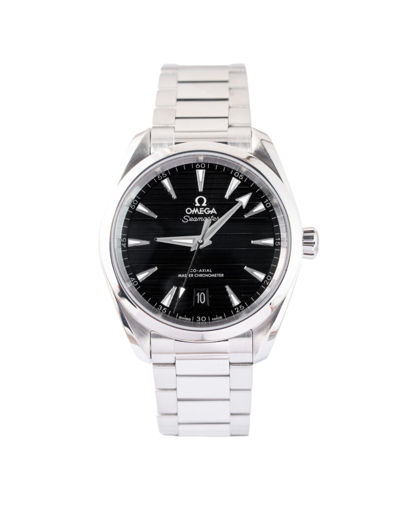 brand: Omega Reference: 220.10.38.20.01.001 Model: Aqua Terra case MATERIAL: Steel strap: Bracelet case Size (MM): 38mm Dial colour: Black Bezel: Steel Year: 09/2018 Condition: Excellent Box papers : Paperwork/box