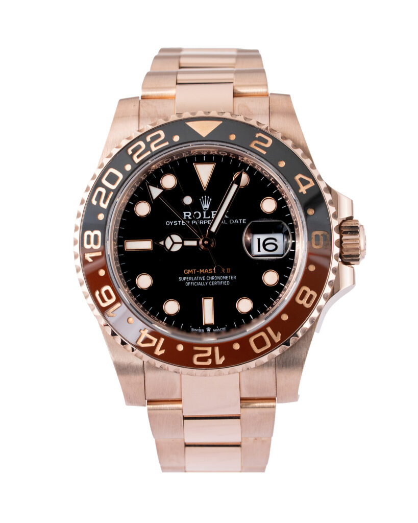 brand: Rolex Reference: 126715CHNR Model: GMT-Master II case MATERIAL: Rose Gold strap: Bracelet case Size (MM): 40mm Dial colour: Black Bezel: Ceramic Year: 05/2022 Condition: Excellent Box papers : Paperwork/box