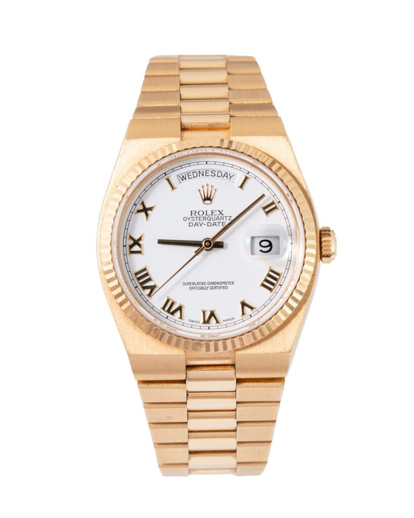 brand: Rolex Reference: 19018 Model: Day-Date Oysterquartz case MATERIAL: Yellow Gold strap: Bracelet case Size (MM): 36mm Dial colour: White Bezel: Yellow Gold Year: 05/2000 Condition: Excellent Box papers : Box