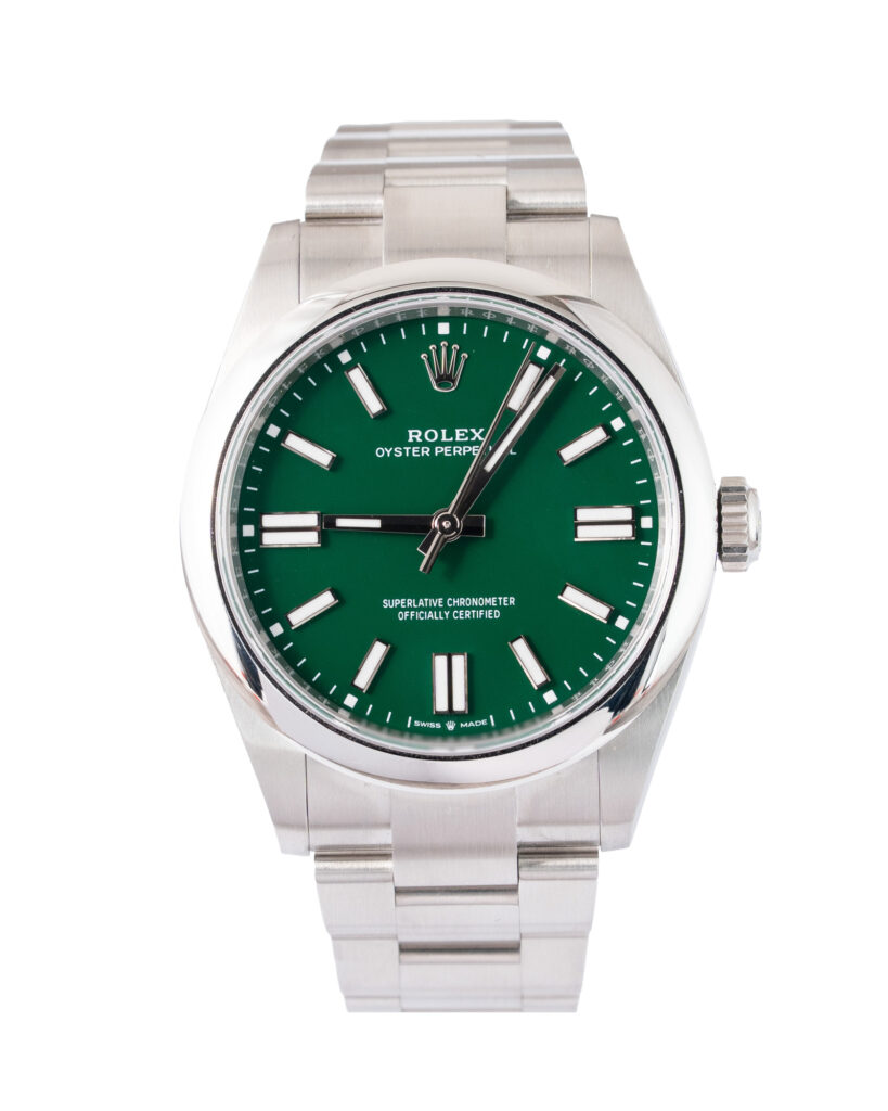 brand: Rolex Reference: 134300 Model: Oyster Perpetual case MATERIAL: Steel strap: Bracelet case Size (MM): 41mm Dial colour: Green Bezel: Steel Year: 10/2025 Condition: Excellent Box papers : Paperwork/box