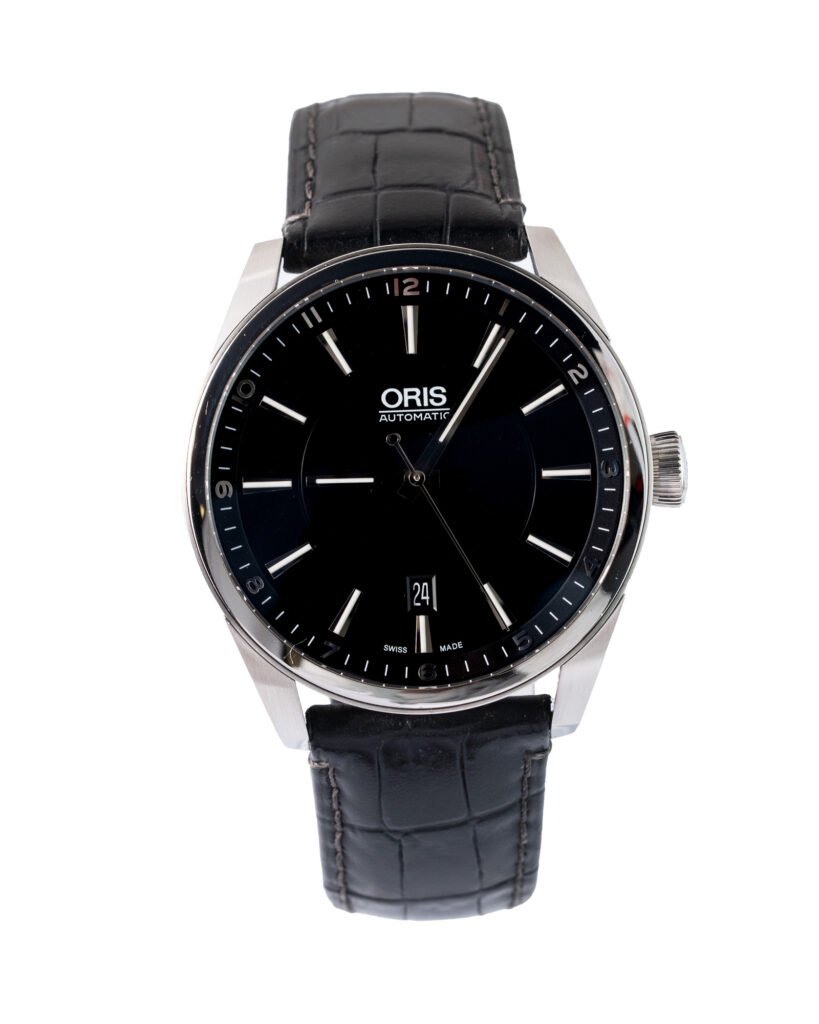brand: Oris Reference: 01 733 7642 Model: Artix Date case MATERIAL: Steel strap: Leather case Size (MM): 42mm Dial colour: Black Bezel: Steel Year: 06/2013 Condition: Excellent Box papers : Paperwork/box