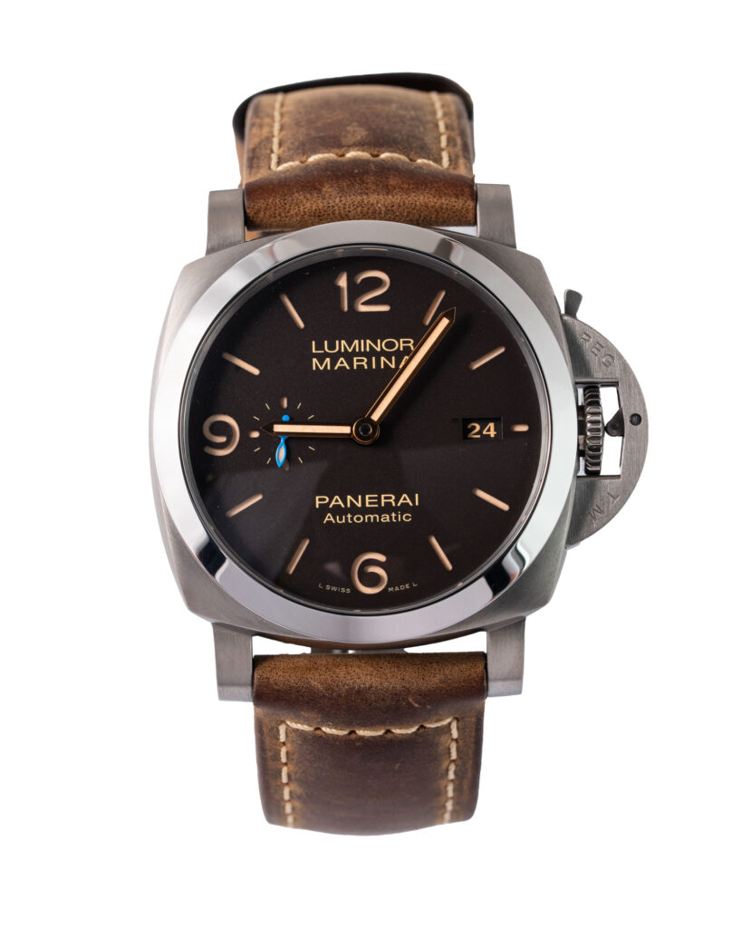 brand: Panerai Reference: PAM01351 Model: Luminor Marina 1950 3 Days case MATERIAL: Steel strap: Leather case Size (MM): 44mm Dial colour: Brown Bezel: Steel Year: 04/2019 Condition: Excellent Box papers : Paperwork/box