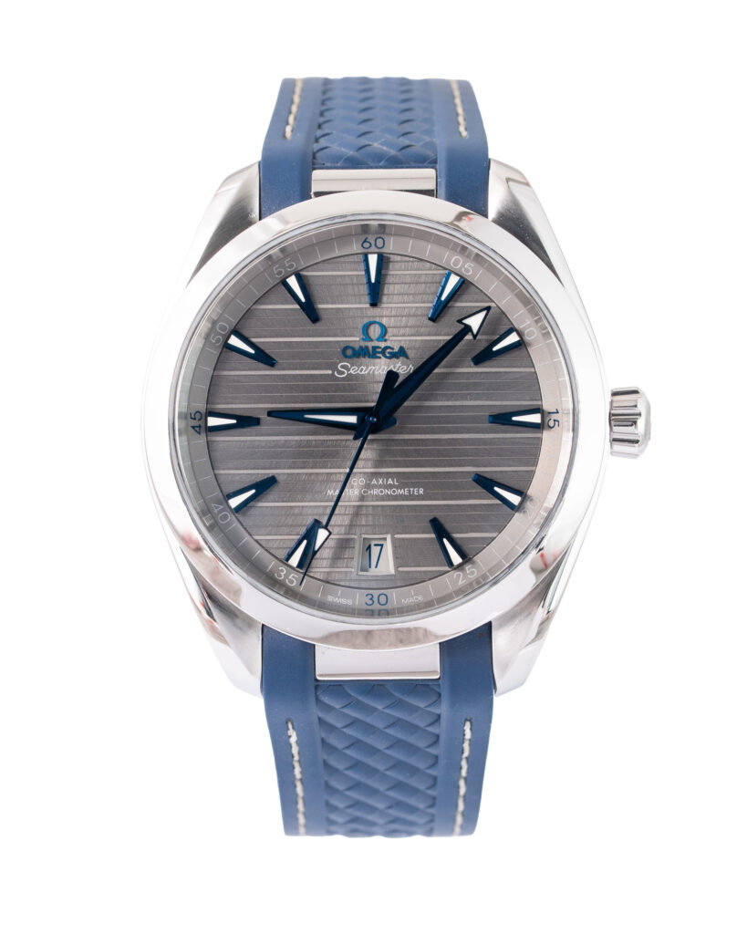 brand: Omega Reference: 220.10.41.21.06.001 Model: Seamaster Aqua Terra case MATERIAL: Steel strap: Rubber case Size (MM): 41mm Dial colour: Silver Bezel: Steel Year: 03/2019 Condition: Excellent Box papers : Paperwork/box