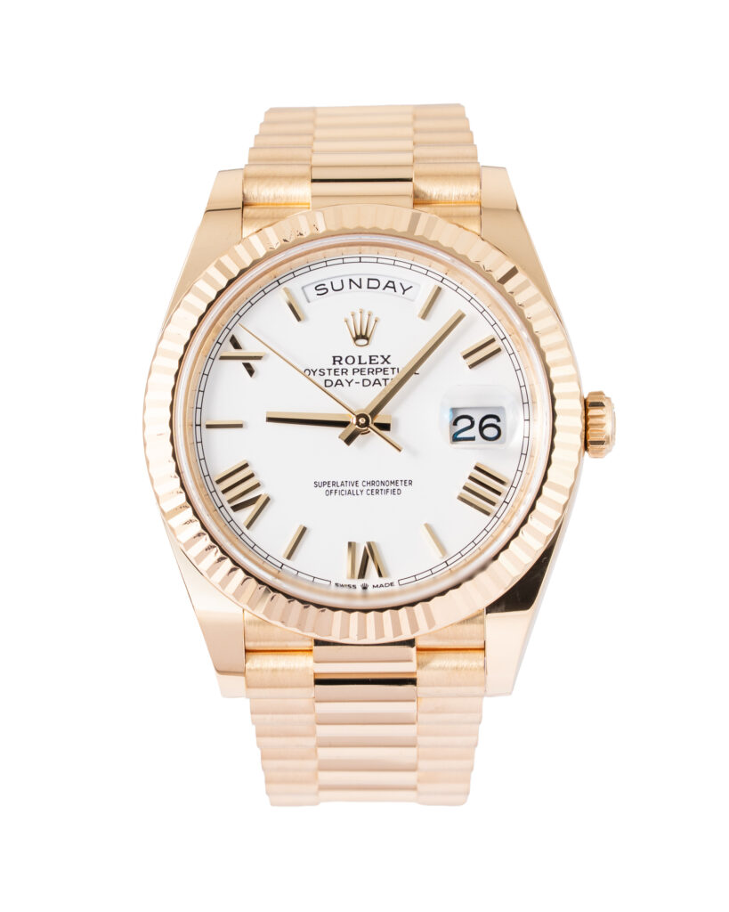 brand: Rolex Reference: 228238 Model: Day-Date case MATERIAL: Yellow Gold strap: Bracelet case Size (MM): 40mm Dial colour: White Bezel: Yellow Gold Year: 04/2023 Condition: Excellent Box papers : Paperwork/box