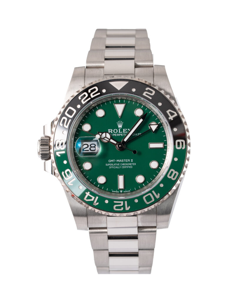 brand: Rolex Reference: 126729VTNR Model: GMT-Master II case MATERIAL: White Gold strap: Bracelet case Size (MM): 40mm Dial colour: Green Bezel: Ceramic Year: 07/2025 Condition: Excellent Box papers : Paperwork/box