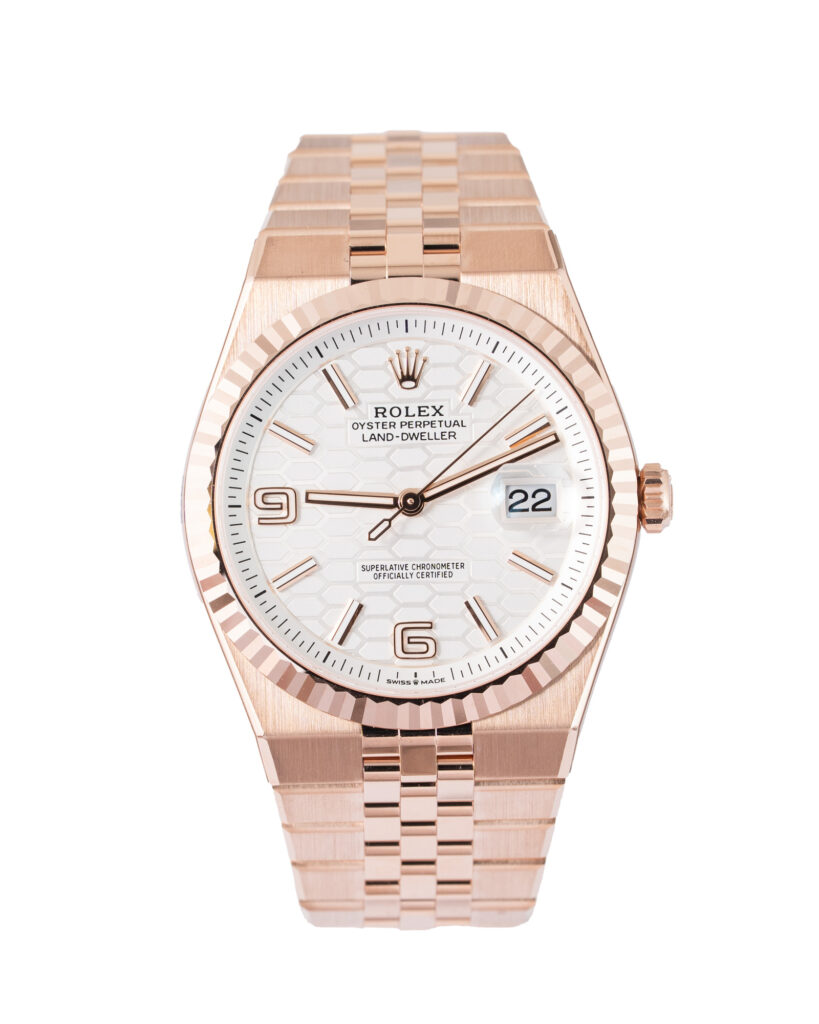 brand: Rolex Reference: 127335 Model: Land-Dweller case MATERIAL: Rose Gold strap: Bracelet case Size (MM): 40mm Dial colour: White Bezel: Rose Gold Condition: Unworn Box papers : Paperwork/box