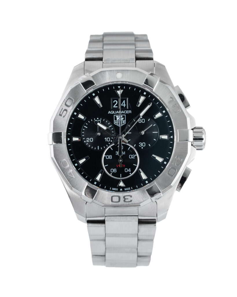 brand: Tag Heuer Reference: CAY1110.BA0927 Model: Aquaracer case MATERIAL: Steel strap: Bracelet case Size (MM): 43mm Dial colour: Black Bezel: Steel Condition: Excellent Box papers : Paperwork/box