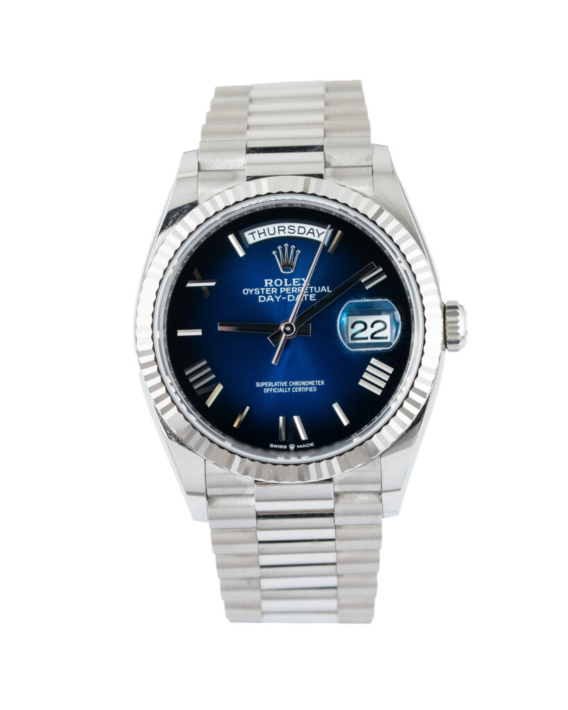brand: Rolex Reference: 128239 Model: Day-Date case MATERIAL: White Gold strap: Bracelet case Size (MM): 36mm Dial colour: Blue Bezel: White Gold Year: 06/2025 Condition: Excellent Box papers : Paperwork/box