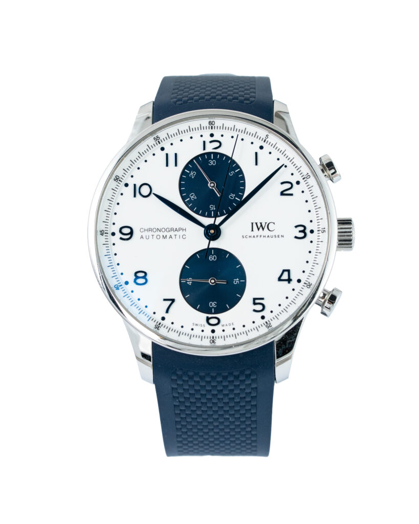 brand: IWC Reference: IW371620 Model: Portugieser Chronograph case MATERIAL: Steel strap: Rubber case Size (MM): 41mm Dial colour: White Bezel: Steel Year: 09/2023 Condition: Excellent Box papers : Paperwork/box