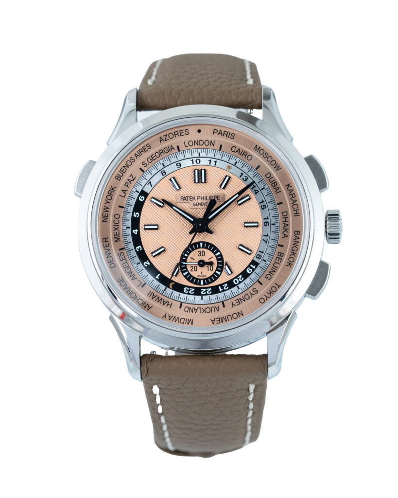 brand: Patek Philippe Reference: 5935A-001 Model: Complications case MATERIAL: Steel strap: Leather case Size (MM): 34.5mm Dial colour: Pink Bezel: Steel Year: 11/2022 Condition: Unworn Box papers : Paperwork/box