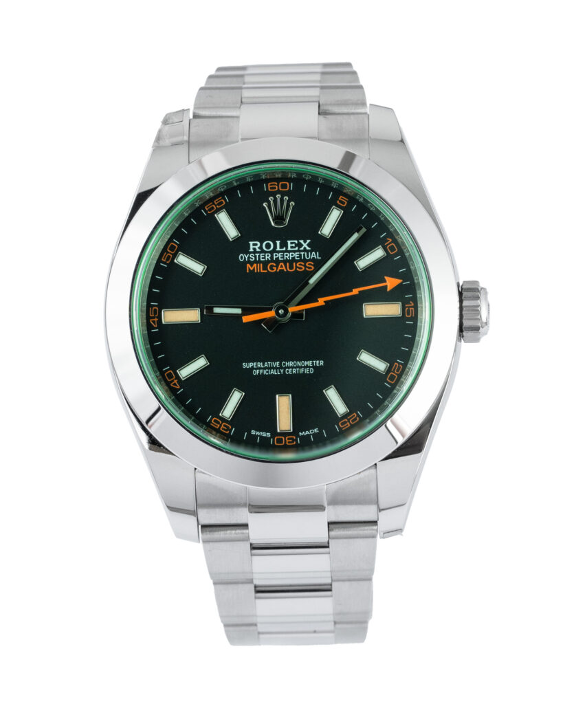 brand: Rolex Reference: 116400GV Model: Milgauss case MATERIAL: Steel strap: Bracelet case Size (MM): 40mm Dial colour: Black Bezel: Steel Year: 04/2022 Condition: Unworn Box papers : Paperwork/box