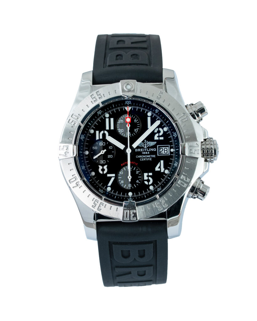 brand: Breitling Reference: A13380 Model: Avenger Skyland case MATERIAL: Steel strap: Rubber case Size (MM): 44mm Dial colour: Black Bezel: Steel Year: 12/2007 Condition: Excellent Box papers : Paperwork/box