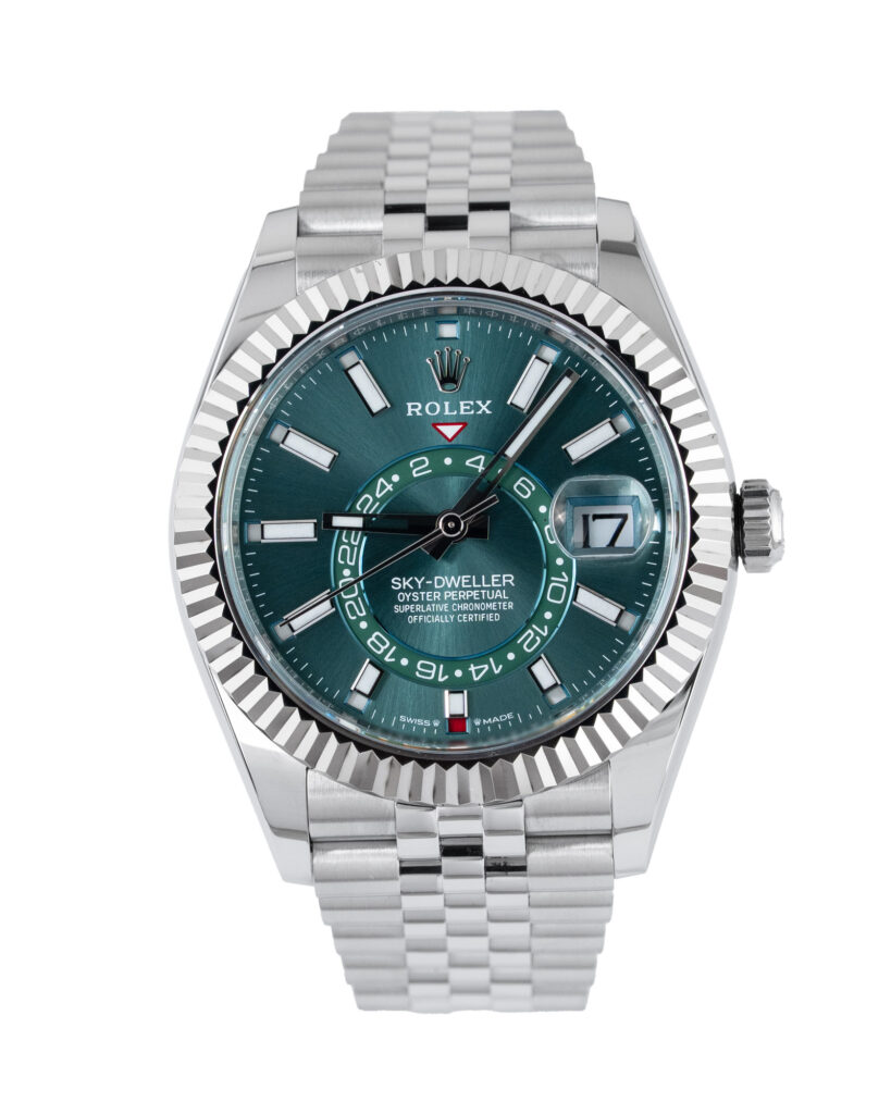 brand: Rolex Reference: 336934 Model: Sky-Dweller case MATERIAL: Steel strap: Bracelet case Size (MM): 42mm Dial colour: Green Bezel: White Gold Year: 07/2023 Condition: Excellent Box papers : Paperwork/box