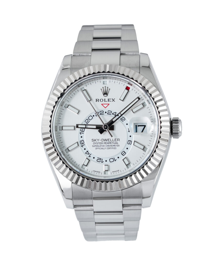 brand: Rolex Reference: 326934 Model: Sky-Dweller case MATERIAL: Steel strap: Bracelet case Size (MM): 42mm Dial colour: White Bezel: White Gold Year: 01/2018 Condition: Excellent Box papers : Paperwork/box