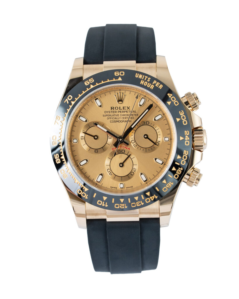 brand: Rolex Reference: 116518LN Model: Daytona case MATERIAL: Yellow Gold strap: Rubber case Size (MM): 40mm Dial colour: Champagne Bezel: Ceramic Year: 11/2022 Condition: Excellent Box papers : Paperwork/box