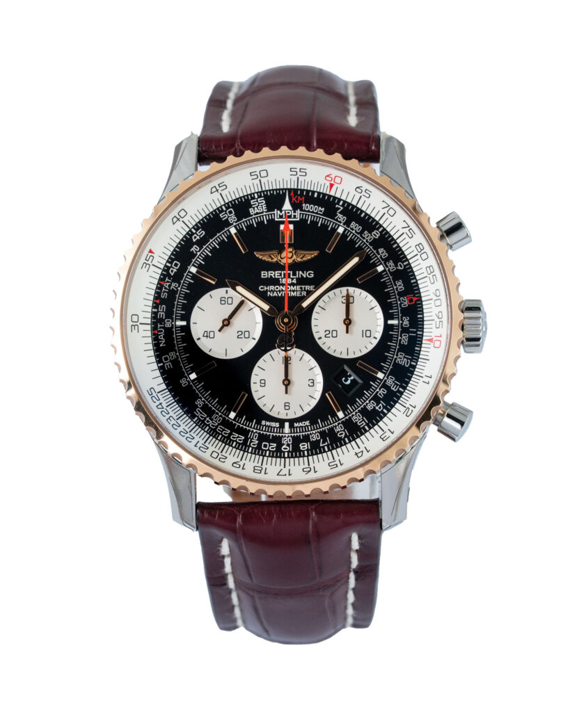 brand: Breitling Reference: UB0127 Model: Navitimer 1 B01 Chronograph case MATERIAL: Steel strap: Leather case Size (MM): 46mm Dial colour: Black Bezel: Rose Gold Condition: Unworn Box papers : Box