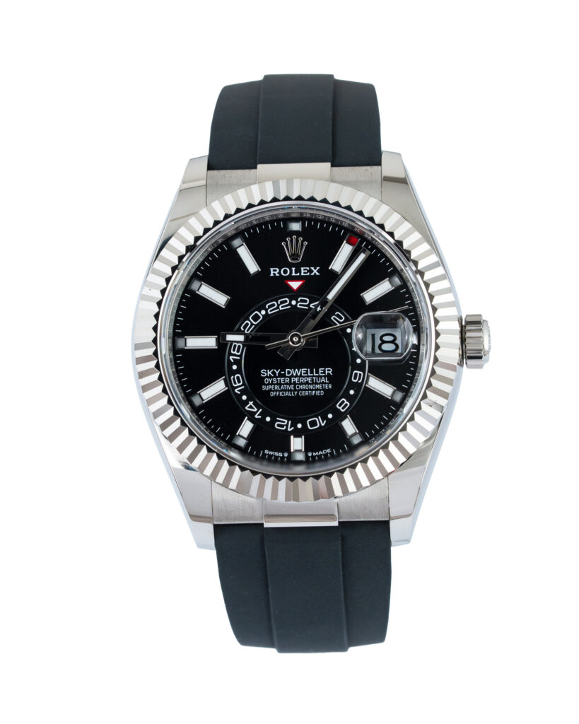 brand: Rolex Reference: 336239 Model: Sky-Dweller case MATERIAL: White Gold strap: Rubber case Size (MM): 42mm Dial colour: Black Bezel: White Gold Condition: Unworn Box papers : Paperwork/box