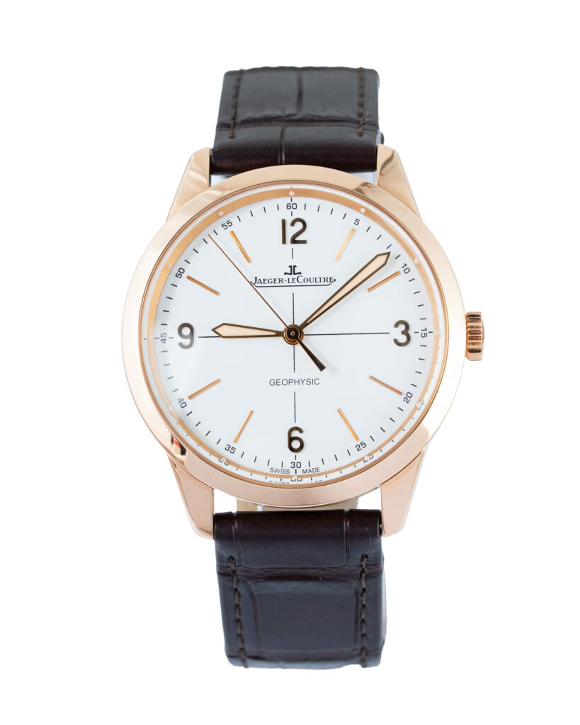 brand: Jaeger-Lecoultre Reference: Q8002520 Model: Geophysic 1958 case MATERIAL: Rose Gold strap: Leather case Size (MM): 38.5mm Dial colour: White Bezel: Rose Gold Year: 05/2014 Condition: Excellent Box papers : Paperwork/box