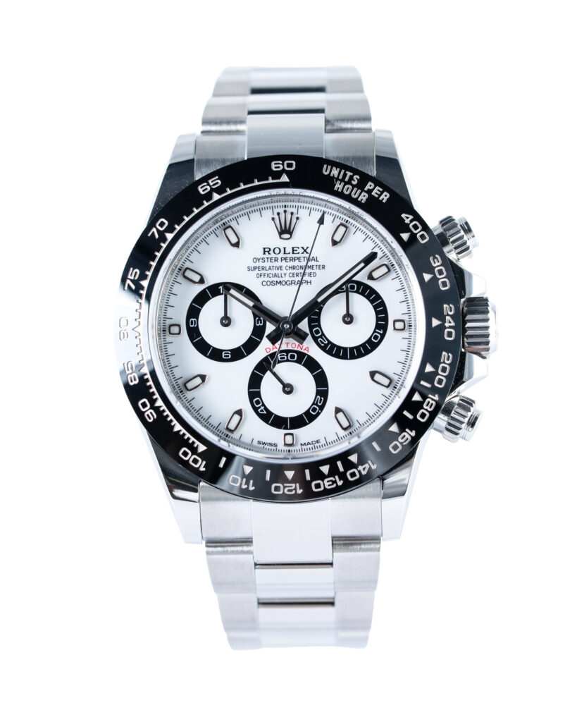 Make: Rolex Reference: 116500LN Model: Daytona Case: Steel Bracelet: Bracelet Size: 40mm Dial colour: White Bezel: Ceramic Year: 06/2021 Condition: Excellent Box papers : Paperwork/box